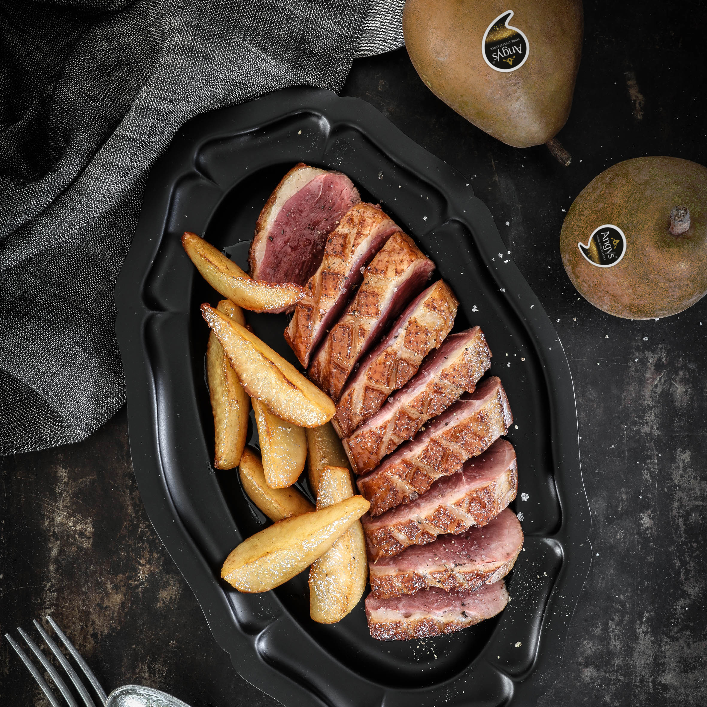 • Faites cuire le magret à feu doux, sans matière grasse, côté peau en premier dans une poêle. Retournez le magret lorsque le gras est bien croustillant et doré.