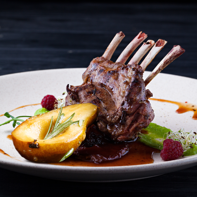 Agneau rôti aux poires Angys® caramélisées et compotée de framboises